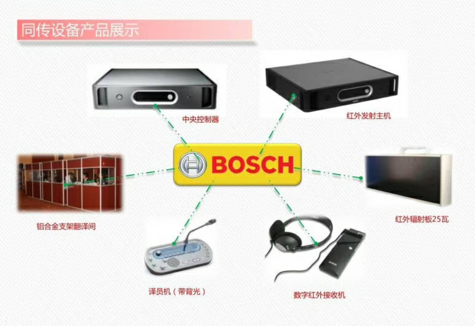 同傳設(shè)備用于實現(xiàn)高級別國際會議同步翻譯,通過設(shè)備可以保證演講者在演講的同時,內(nèi)容被同聲翻譯成指定的語言,通過另外的聲道傳送給聽眾,聽眾可以隨意選擇自己能聽懂的語言頻道。我們使用德國BOSCH(博世)出產(chǎn)的高頻紅外同聲傳譯設(shè)備,其紅外信號段為66波普以上,比其他品牌的紅外同聲傳譯設(shè)備更為穩(wěn)定。