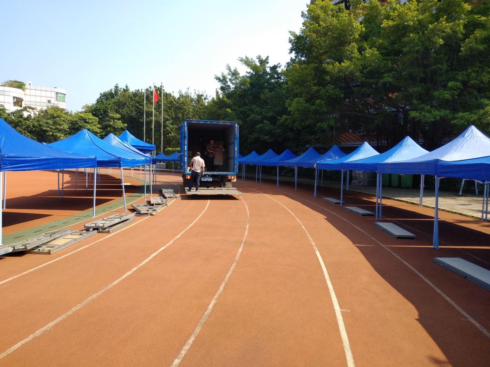 活動(dòng)前一天,招聘會(huì)桌椅布置現(xiàn)場(chǎng),工人還在卸貨搭建