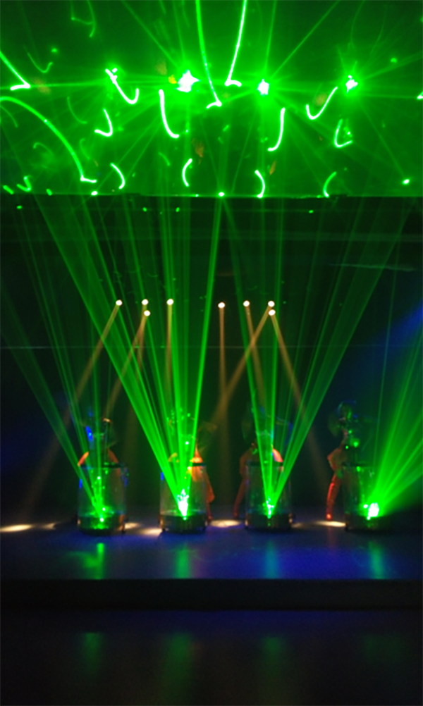 舞者揮動手中神奇的鼓槌,炫彩激光光影伴隨著明快的節(jié)奏律動閃爍,像穿梭時空的迷離亦或是漂浮于未來世界的悸動。激光與打鼓表演藝術(shù)形式巧妙融合,每一次敲擊動作均配合著不同的激光光效效果以及舞者的曼妙姿態(tài),帶來視覺與聽覺的強烈沖擊。