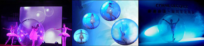 古典舞蹈與現(xiàn)代道具的完美結(jié)合,舞蹈演員用婀娜多姿的身軀跳著童話精靈一樣的舞蹈,極富觀賞價值。舞蹈演員在直徑2米的透明水晶球內(nèi),款款而舞,透過水晶球會隨著舞者的舞步慢慢滾動,配合現(xiàn)場的燈光效果,追光、七彩光、煙霧、泡泡,使得整個舞蹈唯美、浪漫、優(yōu)雅。
