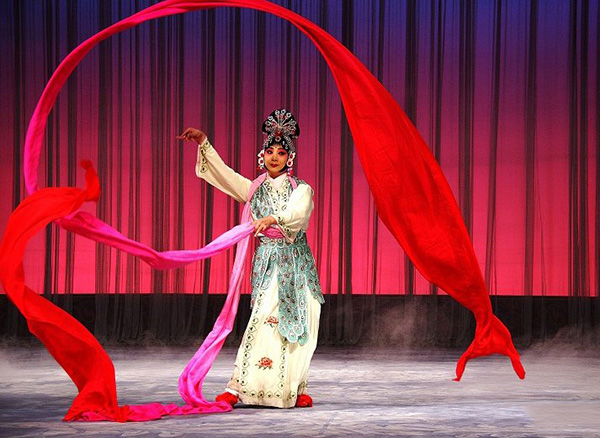 “云路”是全劇最主要的一個(gè)單人歌舞的場面。從唱詞內(nèi)容產(chǎn)生身段,而身段又必須與唱腔的節(jié)奏密切結(jié)合。這場戲天女的扮相是脫了帔露出古裝,而附著在天女胸前的兩根綢帶成了配合歌舞的重要工具。它與一般的線尾子、汗巾、飄帶等附著物不同,因?yàn)橐怀鍪褂盟?,所以綢帶的長度達(dá)到一丈七尺左右,寬一尺二寸,尾端幾尺如果不舞的時(shí)候,就拖在地上。綢帶的使用方法,在以往傳統(tǒng)神話戲《陳塘關(guān)》(即《哪吒鬧海》)里是用二尺長的小棍挑起一條長綢來舞,名為“耍龍筋”。