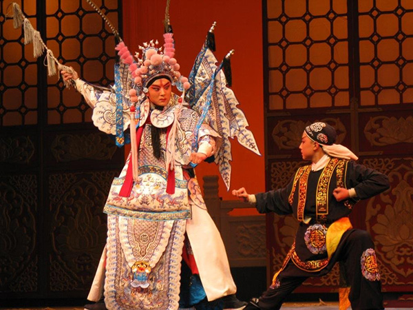 秦腔的表演樸實、粗獷、豪放,富有夸張性。秦腔唱腔分為歡音、苦音兩種,前者表現(xiàn)歡快、喜悅情緒,后者抒發(fā)悲憤、凄涼情感,唱腔音樂豐富多彩、優(yōu)美動人。主奏樂器為板胡,發(fā)音尖細而清脆。在臉譜(如秦始皇的金色正三塊瓦花臉、帶一字須)、身段(如趟馬、拉架子、擔柴擔、水擔等)、化妝(如改包頭為梳水頭)、特技(吐火、吹火、踩蹺),以及語言聲韻(秦腔是十四韻,內(nèi)有入聲)等方面,都有自己獨特的風格。“唱戲吼起來”被譽為關(guān)中十大怪之一。角色行當分為四生(老生、須生、小生、幼生)、六旦(老旦、正旦、小旦、花旦、武旦、媒旦)、二凈(大凈、毛凈)、一丑,計十三門,又稱“十三頭網(wǎng)子”。